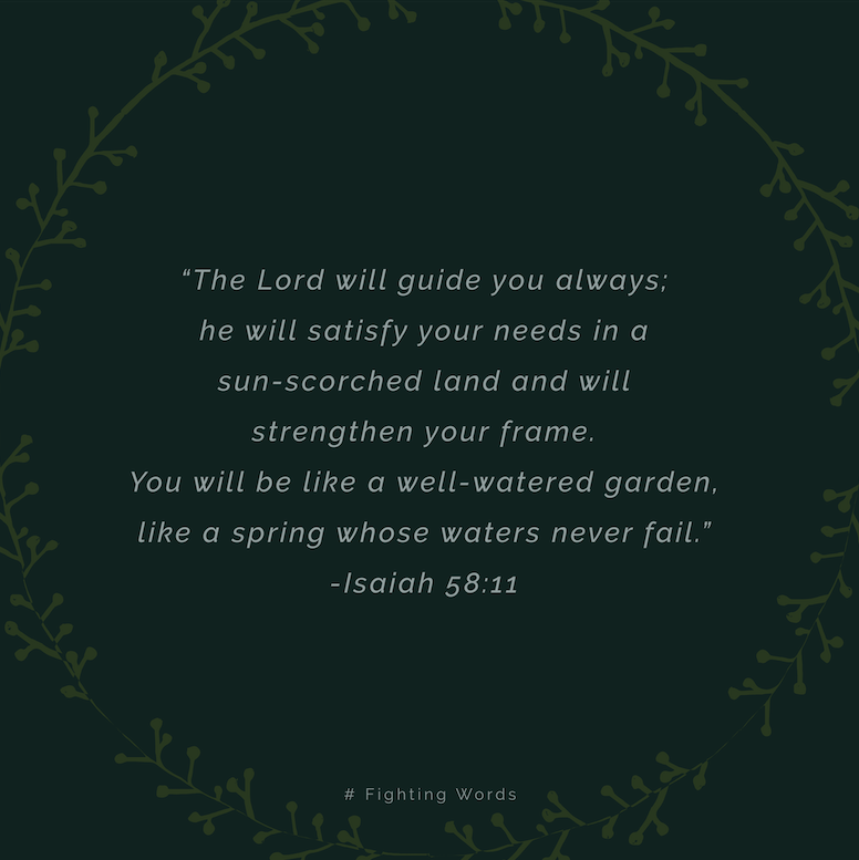 “The Lord will guide you always; he will satisfy your needs in a sun-scorched land and will strengthen your frame. You will be like a well-watered garden, like a spring whose waters never fail.”